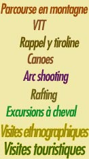 Nos guides sont des personnes responsables, qui habitent dans la region et font un ªtude continu et constant de la m¹me. C'est pour cella qu'ils sont qualifiªs pour dªvelopper des activitªs d'ethnographie, d'histoire, de gastronomie, de montagne, de biologie, de secourisme, de sport, de gªologie, etc. et complªter ainsi vos visites. |